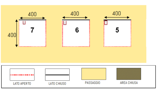 DESCRIZIONE Area quadrata con apertura su tre lati. Il lato che potrà essere allestito è quello posteriore, indicato sul disegno come lato chiuso.